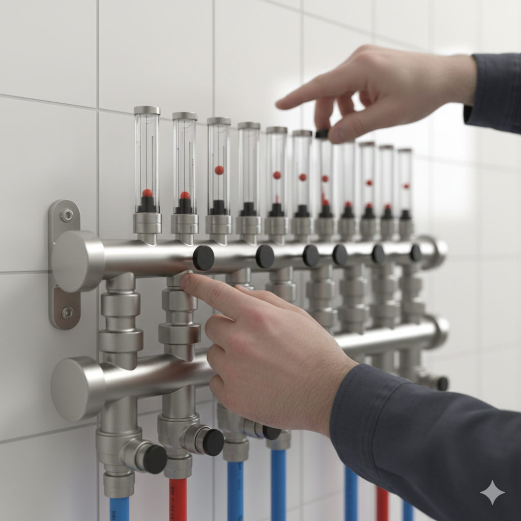 Kollektör üzerindeki debi göstergeleri kullanılarak her devre ayrı ayrı ayarlanmalıdır.